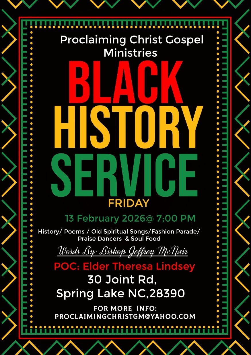Proclaiming Christ Gospel Ministries 30 Joint Rd, Spring Lake, NC, United StatesCelebrating Our Roots & Our Reach! ✊🏾🥁✨ Proclaiming Christ Gospel Ministries invites YOU to our Black History Service on Friday, February 13th! Get ready for an evening that honors our history and celebrates our future. From the rhythm of old spirituals to the grace of our praise dancers, this is a night you won't want to miss!